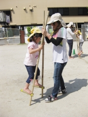 4月17日より、年長組ひかり組の竹馬の挑戦が始まりました。