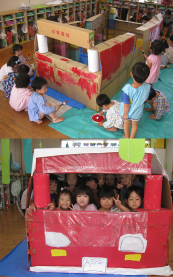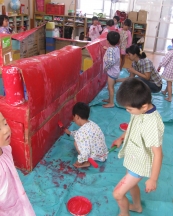 段ボールをたくさん集めて来て、大型積み木を柱に、土台ができ、みんなで色を塗りました。