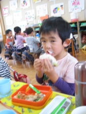 ほし組は、給食の時、ご飯にゆでたお芋をご飯にまぜて、ゴマ塩を入れて、大きなおにぎりにして食べました。