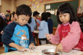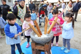 天気に恵ま れ、園庭で蒸したお米を、うすに入れて、ぺったんぺったんお餅をつきました。つきたての 餅を、砂糖醤油で食べ、ホールでは、大根もち、黄粉もち、ぜんざいなど、お母様のご 協力により、おいしくいただきました。