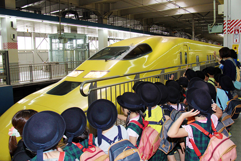 「新幹線のお医者さんだよ。」イエロードクターを初めてみることができて大歓声をあげていました。