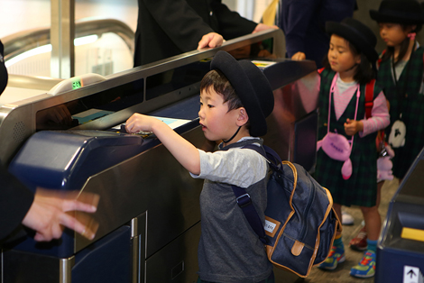 「切符が出てきたよ。」自分でお金を払って買った切符を改札口に通しました。上手にできましたね。