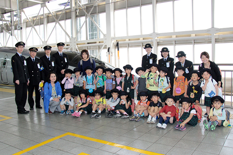 駅員さんたちがお出迎えしてくださって、みんなでパチリ! お土産もいただいて嬉しそうでした。 博多駅の駅員さん方、お世話になりました。