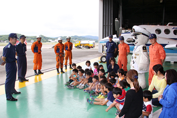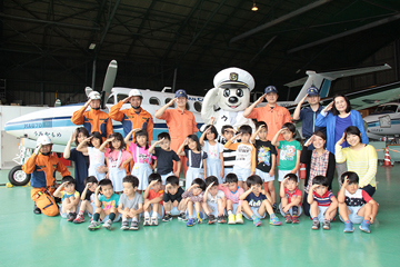たくさんの方がお迎えして下さって、「海に行くときは大人と一緒に。」などの話をしてくださいました。また、飛行機の操縦席に一人ひとり座らせてもらったので、子ども達は大はしゃぎでした。「操縦席にはボタンや時計がいっぱいあってびっくりしました。」