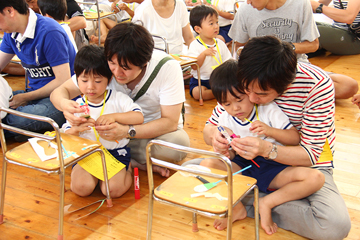 お父さんに抱っこされて嬉しそう。僕たちだけでは上手くできないところも、お父さんが助けてくれるから大丈夫!素敵な作品ができました。