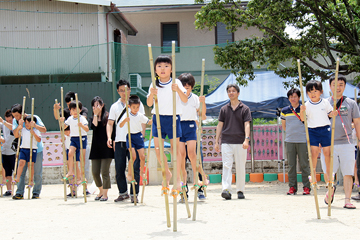 自分だけの竹馬ができて嬉しいなあ。お父さん見ててね!こんなに高い竹馬もスイスイ乗れるようになったよ。