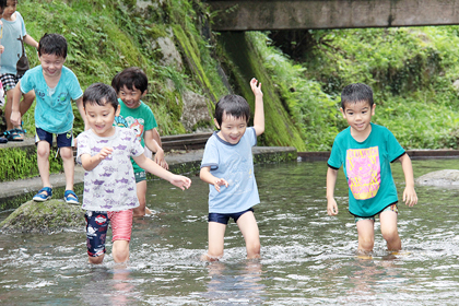 待ちに待った川遊び、ジャブジャブ水の中に入っていきました。 「ちょっと冷たいけど、川の水って気持ちいいね。」と、水のかけ合いなどして大はしゃぎでした。