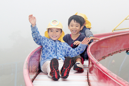 広々とした記念の森にある巨大なヤスゴン(アスレチック)。周りは濃い霧で何も見えなかったけど、 楽しみにしていた長い長いすべり台を何度も滑りました。