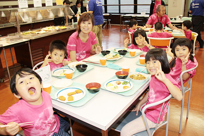 たくさん動いたからおなかもペコペコ。夕食はバイキングだったので、自分でおかずを選びながらお皿に盛っていきました。大好きなハンバーグやカレー、サラダなどたくさん食べてお腹いっぱいになりました。