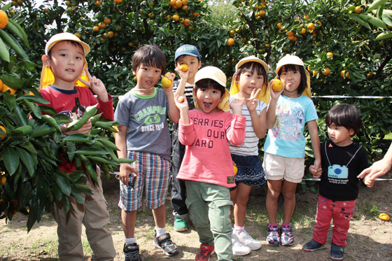 たくさん実がついている木から色のついたミカンを選びまし た。その場で皮をむいてムシャムシャ。「甘くてとってもおいしいね。」