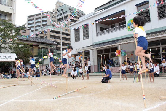 マイ竹馬をお父さんと作って以来、6月からずっと練習を重ね てきた光組さん。頑張りマメもできたけど誰も諦めません。全員、竹馬の腕を上げ、難しい片足ケンケンも上手にできるよ うになりました。