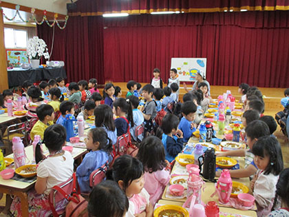 クラスの枠を外し、雪・星・光のたて割グループで食べました。一番小さな雪組さんは、お兄ちゃん・お姉ちゃん達が優しくお世話をしてくれたのでとっても嬉しそうでした。
