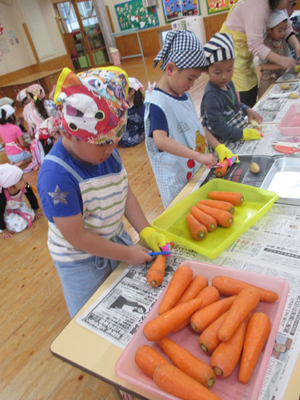 皮むき上手な男の子たちは、むき残しがないように、ピーラーでシュシュとむいていきます。力を合わせれば、こんなにたくさんのにんじんもアッという間ですね。