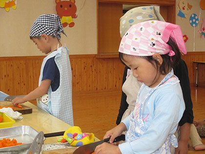 ちょっぴりドキドキするけど、しっかり包丁を持ってにんじんを切っていきます。指を丸めたネコの手で押さえながら、上手に切ることが出来ました。玉ねぎ、ジャガイモにも全員チャレンジして、たくさんの材料が準備できました。
