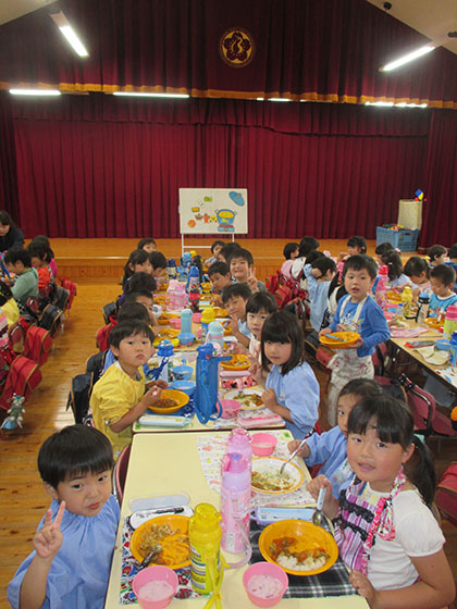ホールがランチルームに早変わり。リーダーさんの「いただきます。」に合わせて、目の前のカレーをおいしそうにもりもり食べ始めました。「たくさん食べるぞ。」