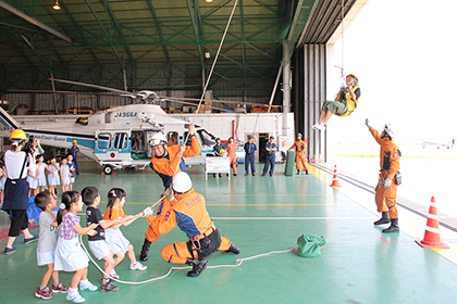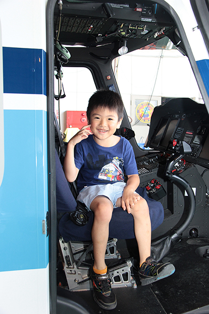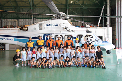 紙芝居を見ながら「海にごみを捨てないこと」の大切さを教えてくださったり、つり上げ救助やヘリコプターの操縦席に乗る体験をさせてもらったりしました。