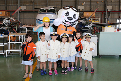 制服を着て写真撮影もしました。うみまる君が大人気で、子ども達は、握手をしたり抱っこしたりしてもらって大はしゃぎでした。