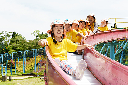 広い記念の森に入ると、そこには巨大なヤスゴン(アスレチック)が住んでいました。友達と一緒に、長い長いすべり台をスイスイすべったり、広い芝生の上を走り回ったりして、とっても気持ちよかったね。