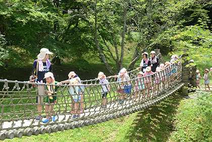 ゆらゆら揺れるつり橋を渡るのは勇気がいったけど、友達と励まし合いながら全員渡れることが出来ました。みんなよく頑張ったね。