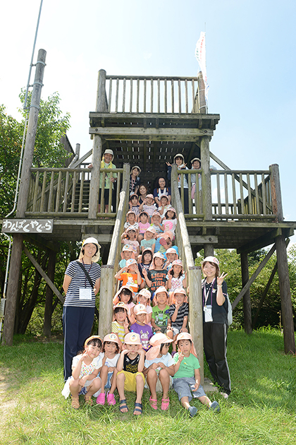 「わんぱくやぐら」から見渡すと、遠くまで緑が広がっていました。ずいぶん高い所まで登ってきたんだね。階段に座って「ハイ、ポーズ!」