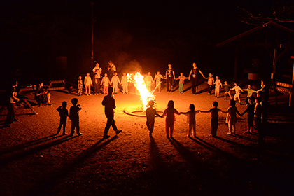 夜は、燃え盛る火を囲んでのキャンプファイヤー。火の神様から、「勇気の火、なかよしの火、がんばりの火」3つの火をもらって、みんなの心が強くなりました。その後、踊ったり歌ったりして、楽しい時間を過ごしました。