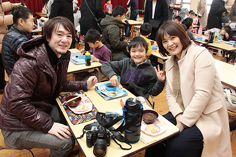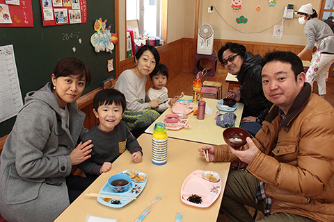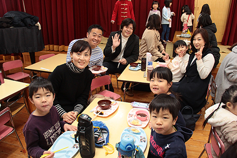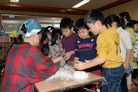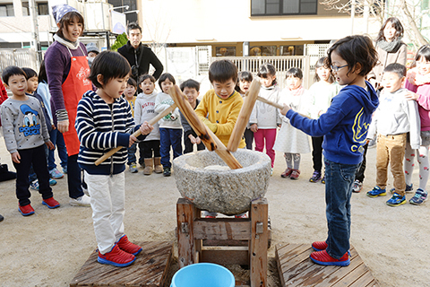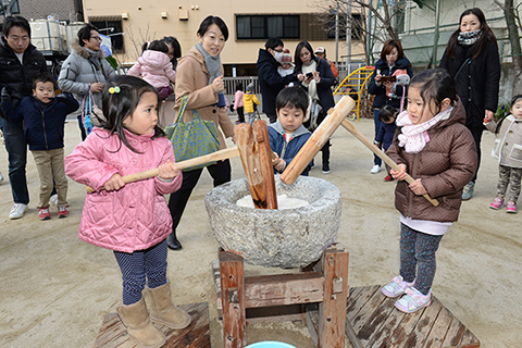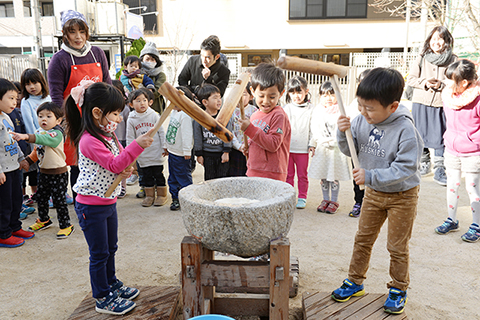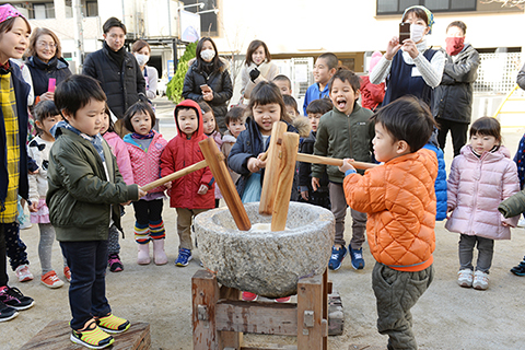 蒸したお米をうすに入れ、「ペッタン、ペッタン、ペッタンコ」と、大きなかけ声をかけながらお餅つきをしました。3人で杵を持って心を一つにしてついていくと、だんだんおいしそうなお餅が出来てきました。ついている人だけでなく、周りで見ている人にも力が入って、みんな揃って楽しいもちつき大会になりました。お餅をついた後は、お母様方のご協力で、きなこ餅やぜんざいにしておいしくいただきました。