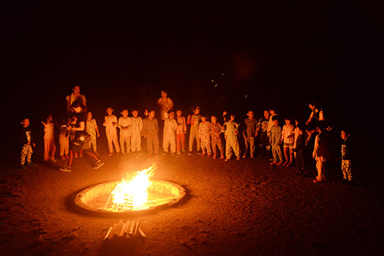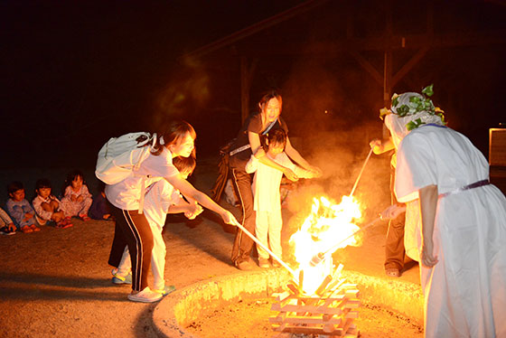 夜は、燃え盛る火を囲んでのキャンプファイヤー。火の神様から、「協力の火、やさしさの火、なかまの火」をもらって、みんなの心が強くなりました。その後、踊ったり歌ったりして、楽しい時間を過ごしました。