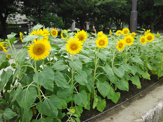 光組のみんなで育てた、大濠公園のひまわり、満開に咲いています。私たちのひまわりは高さも揃っていて、力強く咲いているので、大濠公園に遊びに来ている方も 海外の観光客の方もよく写真を撮って行かれます。よかったら見に来てください