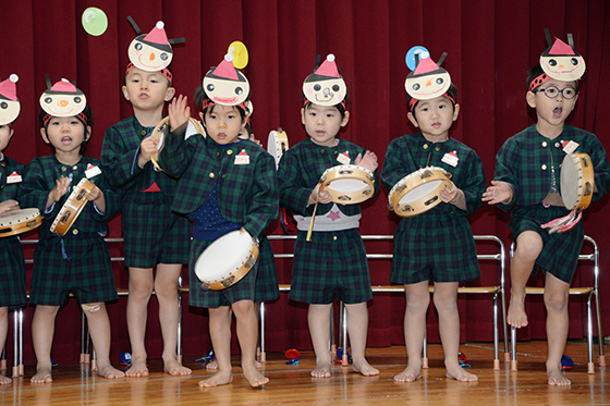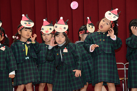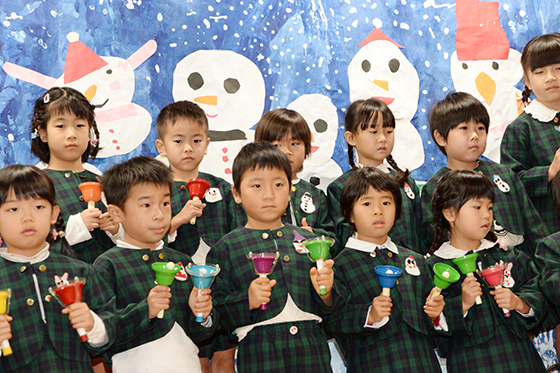 ひかり組さんは、きれいな音色のハンドベルで演奏したり、トナカイのお家を作ったり、ちびっこサンタに変身したりして、楽しいステージをくりひろげました。2つの曲を合体させ歌った声がきれいに調和して素晴らしかったです。また、サンタさんがプレゼントを届ける国を国旗に表して紹介してくれました。
