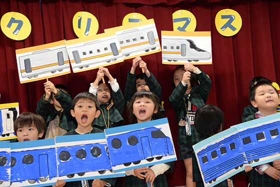 ほし組さんは、電車遊びをしながら七隈線の駅名を覚えたり、電車の名前を取り入れた「ドレミファ電車の歌」を作って歌ったりしました。「ドクターイエローのド」「レールスターのレ」と替え歌でたくさんの電車を紹介してくれて、「いろんな電車を知っているのね。」と、お家の方が驚いていました。