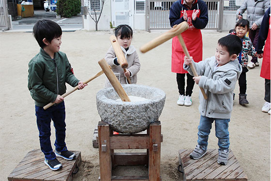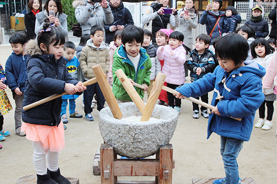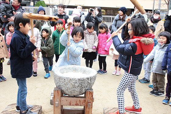お家の方が大勢集まって見守っていただく中で、子ども達は力いっぱい杵をふりあげ、もちつきをしました。クラスの全員がつき終わる頃には、臼の中に柔らかなお餅が出来あがりました。寒い日でしたが、だんだん体が暖まり、みんな揃っての楽しい餅つき大会になりました。