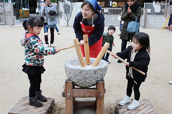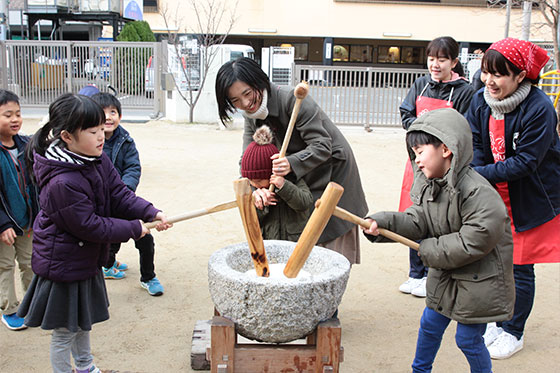 大きなかけ声が園庭中に響き渡り、もちつき大会が始まりました。