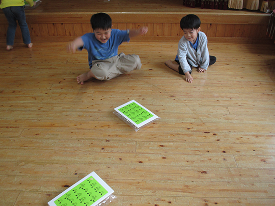 「よくすべらせるためにはどうしたらいいかなあ。」と、ホールいっぱいにスライダーを滑らせながら、楽しそうにいろいろと試していました。