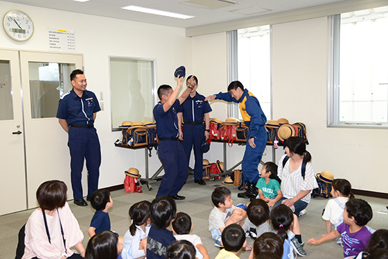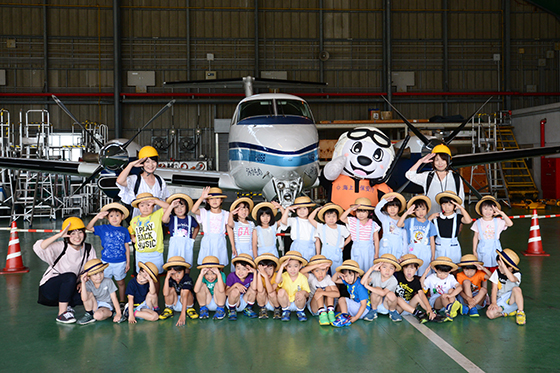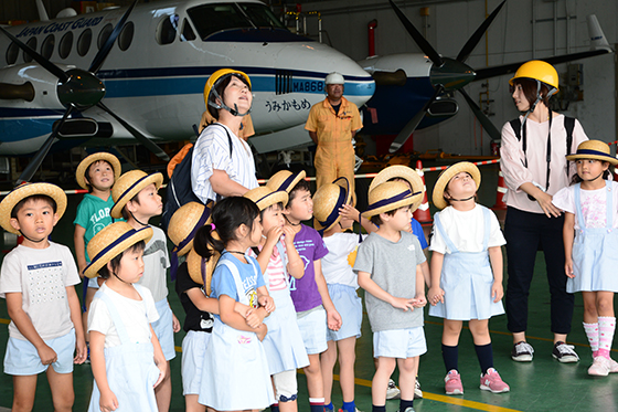 「海にごみを捨てないこと」の大切さを学びました。つり上げ救助やヘリコプターの操縦席に乗る体験に、初めてのことで子どもたちはワクワクドキドキ。制服を着ての写真撮影もしました。出迎えてくれたうみまる君が大人気で、子ども達は、握手をしたり抱っこしたりしてもらって大はしゃぎでした。