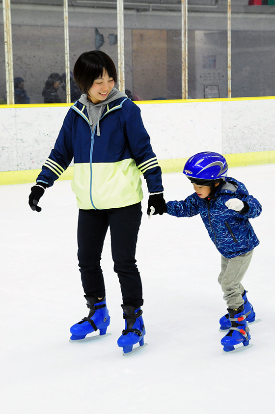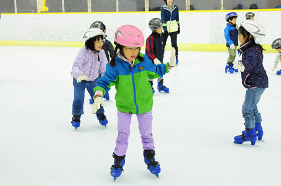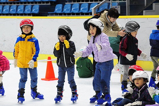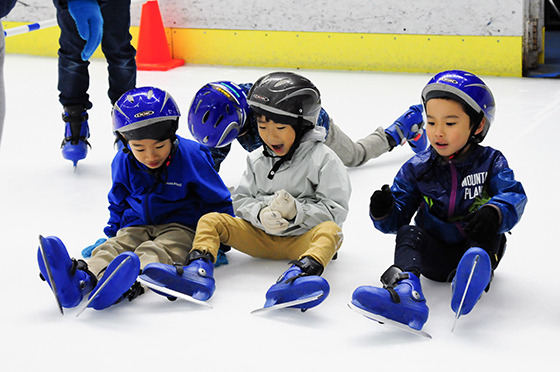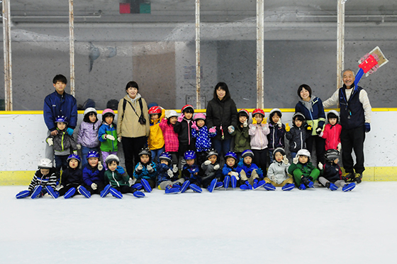 スケート場に着くと、コーチから、靴の履き方やリンクの上での立ち方など、一つ一つ丁寧に教えてもらいました。はじめはつるつる滑って立つこともできなかった子ども達でしたが、何度も転びながら、いつの間にか全員が滑れるようになりました。