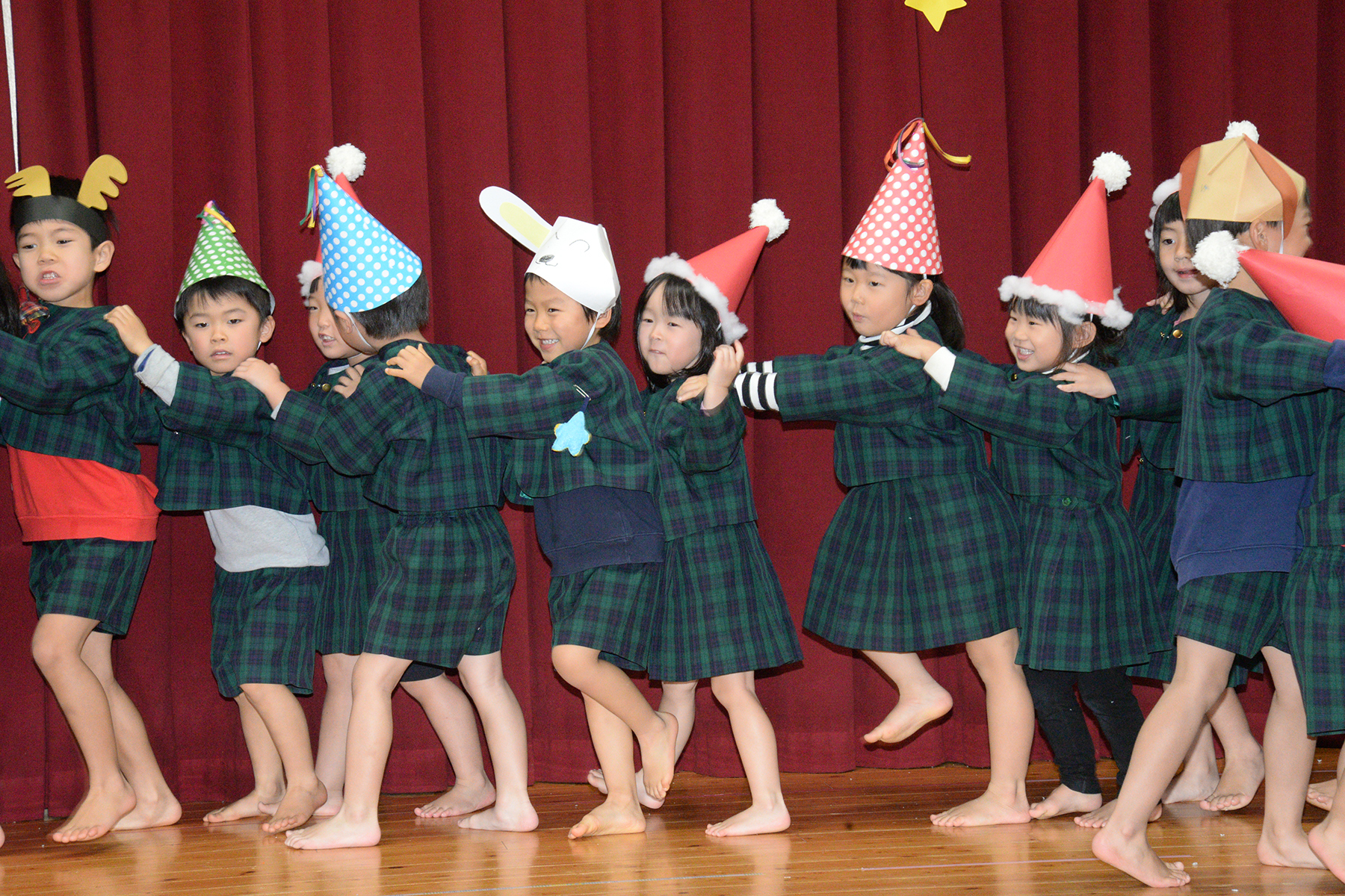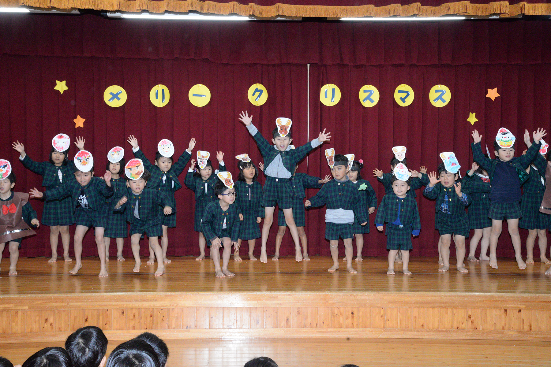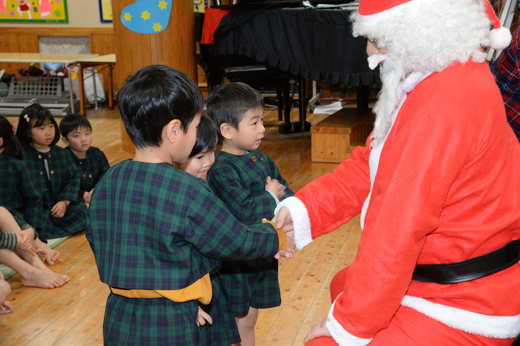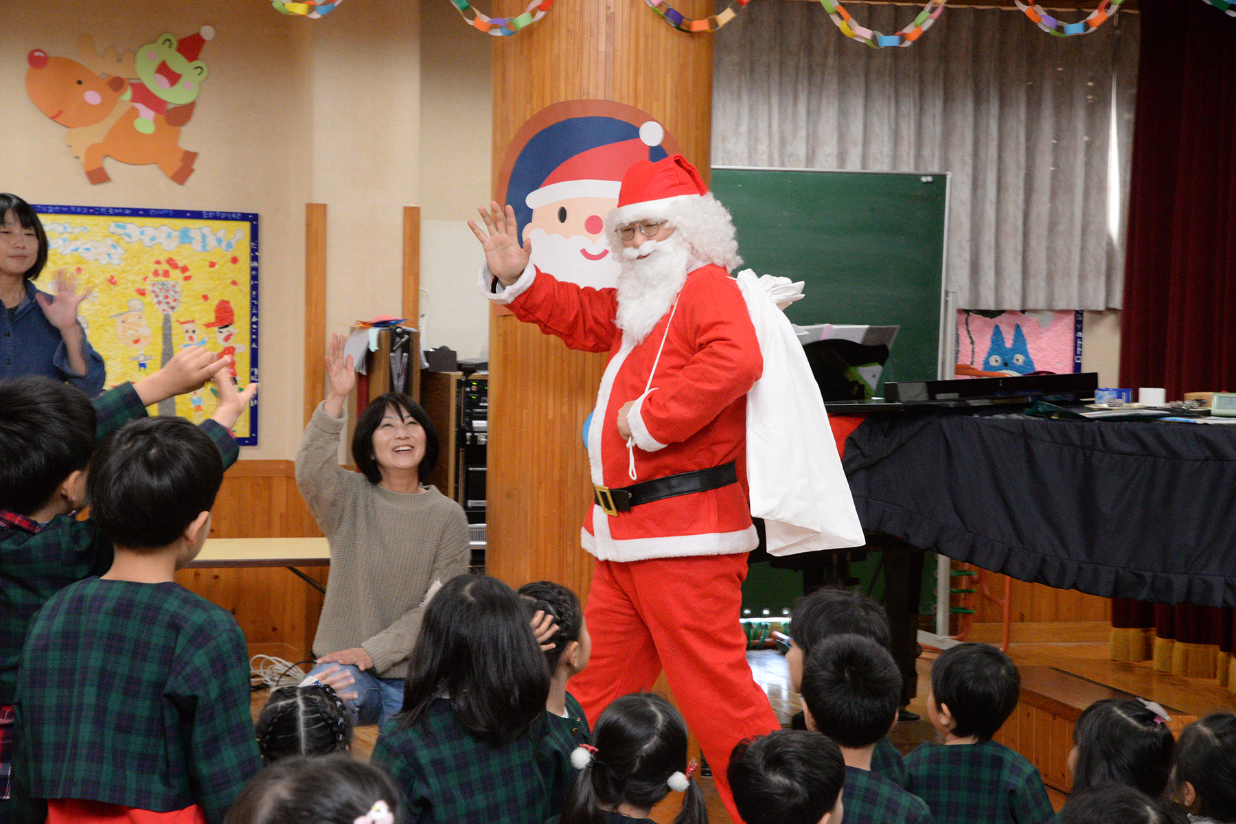 ひかり組のキャンドルサービスで始まったクリスマス会。縦割りグループ(フレンド)に分かれて、歌やダンスなどの発表をして楽しみました。 そこに突然、鈴の音と共に大きくて優しそうなサンタさんが現れました。サンタさんは、たくさんのプレゼントを持ってきてくれて笑顔いっぱいの子どもたちでした。