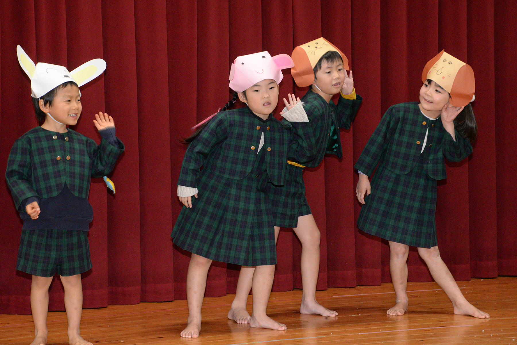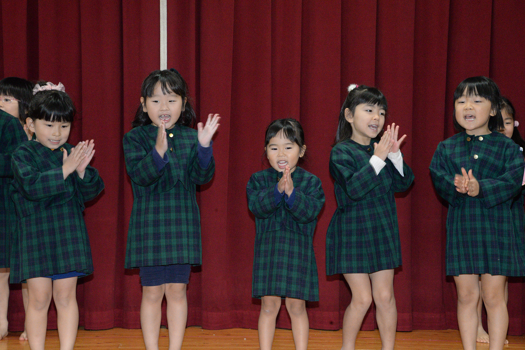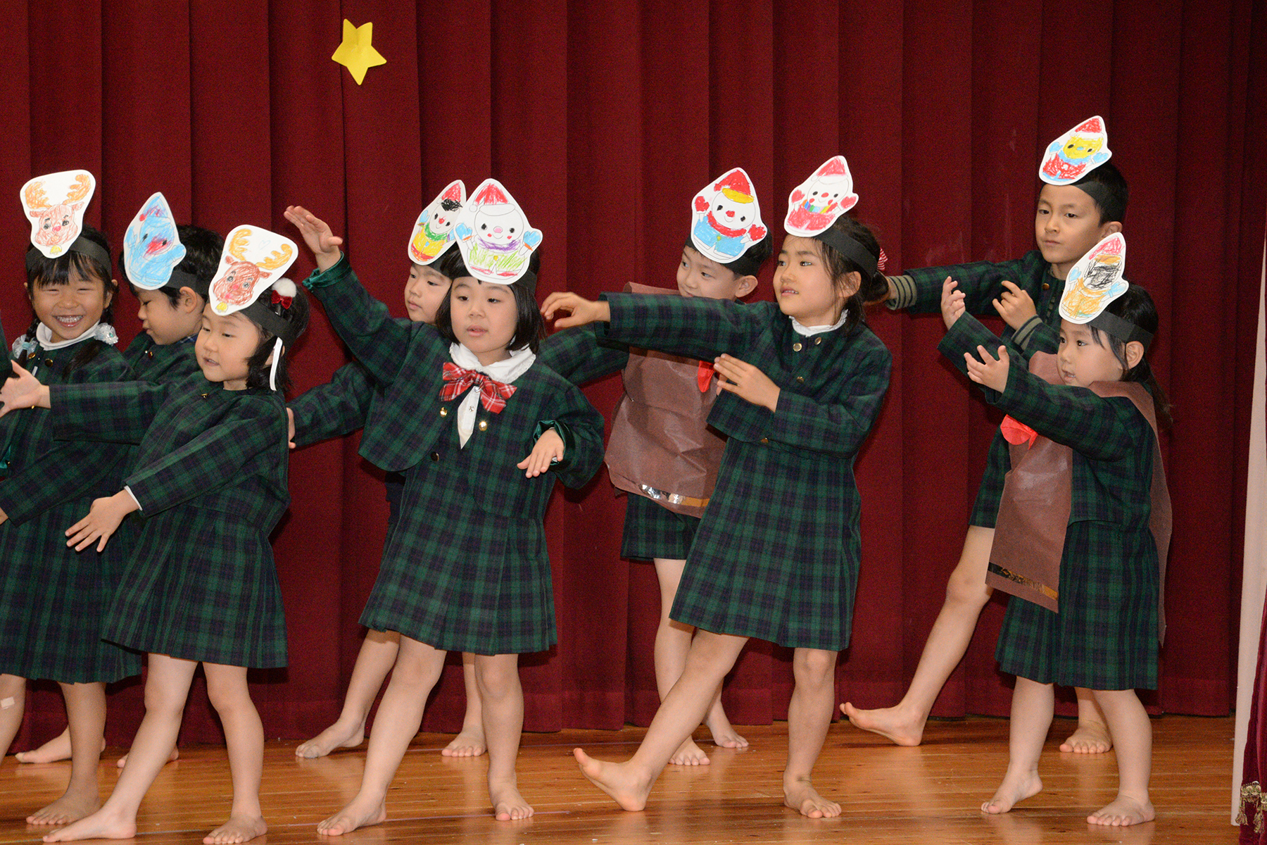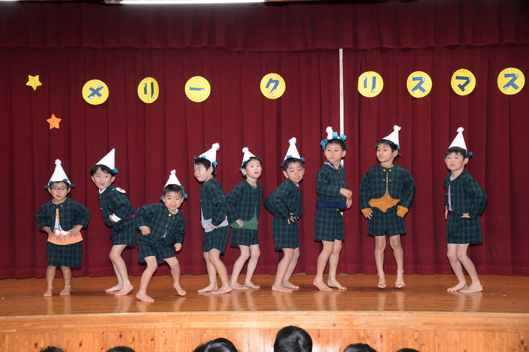 ひかり組のキャンドルサービスで始まったクリスマス会。縦割りグループ(フレンド)に分かれて、歌やダンスなどの発表をして楽しみました。 そこに突然、鈴の音と共に大きくて優しそうなサンタさんが現れました。サンタさんは、たくさんのプレゼントを持ってきてくれて笑顔いっぱいの子どもたちでした。